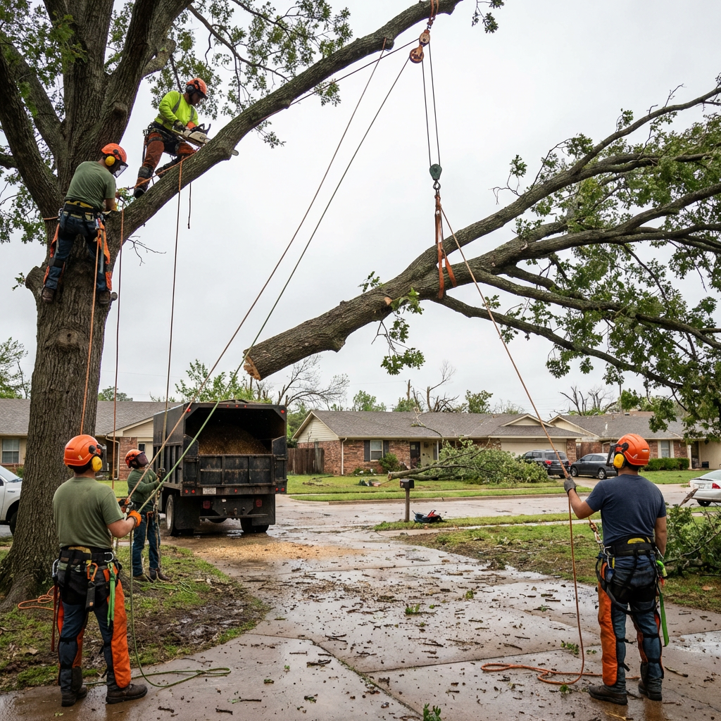 Storm damage is constant — Oklahoma's severe weather season runs spring through fall. Tornadoes, straight-line winds, and ice storms regularly split, uproot, and drop large trees. Emergency removal after a weather event is one of the most common calls we receive.